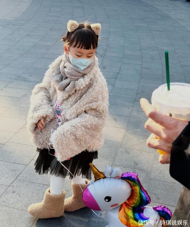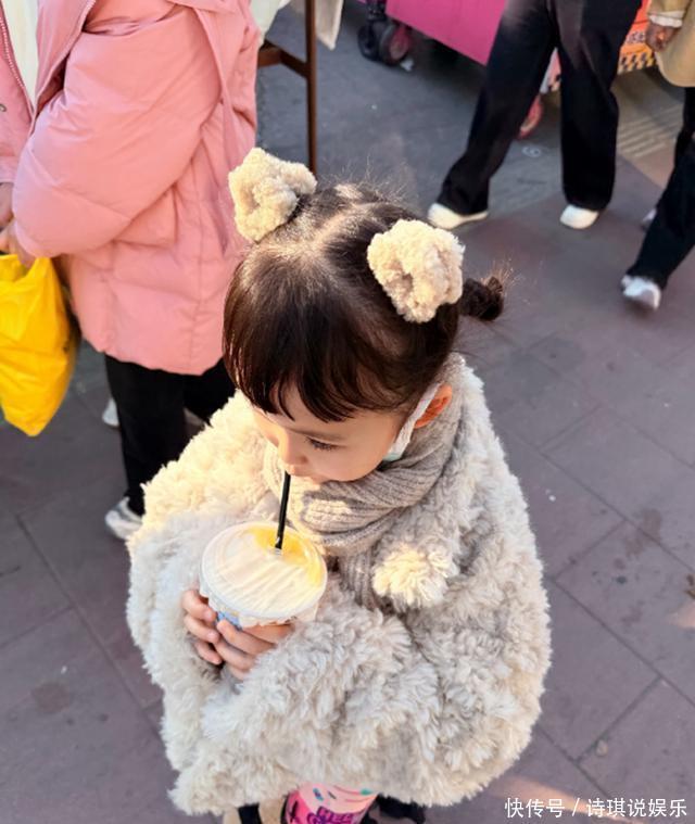 她跟着爸妈在外面走。手里捧了杯喝的。她低着头,正用吸管喝东西。动作很平常,就是小孩喝饮料的样子。她没看镜头,光顾着喝手里的东西了。能看出来皮肤挺白。眼睫毛长得密。这小孩长得像爸妈好看的地方。别的方面也挺顺眼。